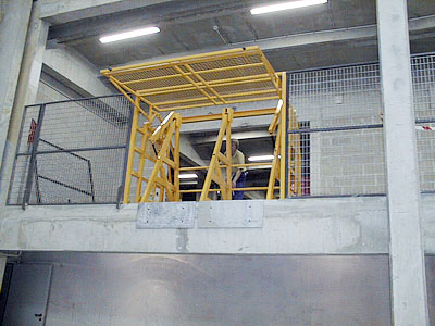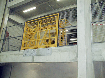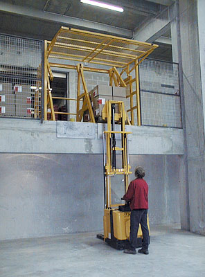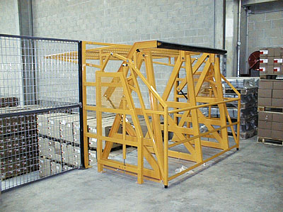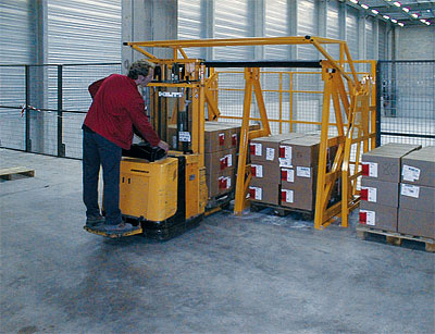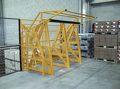 Ecluse renforcée permettant de retenir simultanément et indépendamment un chariot à mâts, des palettes lourdes glissant sur les fourches, des colis de masse élevée pouvant se déplacer au freinage du chariot.